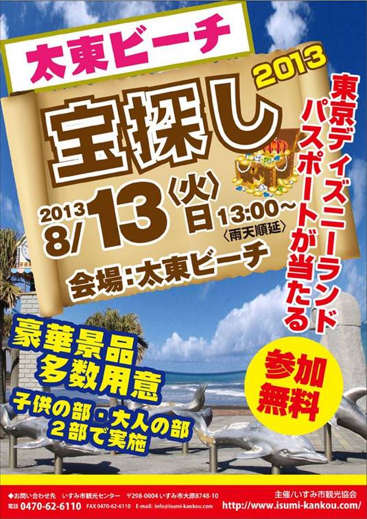 雄大な太平洋を目の前に大きく砂浜の拡がる太東ビーチ、砂浜から幸運を探しましょう。砂浜には豪華な賞品が埋められています。