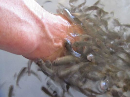 支配人が、ドクターフィッシュの桶に手を入れたところ、